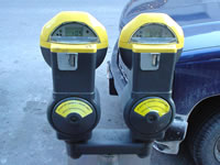 路肩に右写真のようなメーターがたくさん並んでいるのをよく見かけます。これがパーキングメーターです。脇に車を停め、クオーター(25 セントコイン)を必要枚数入れて使います(コイン一枚あたりの駐車時間は場所によって異なります。だいたい 15 ~30 分です)。